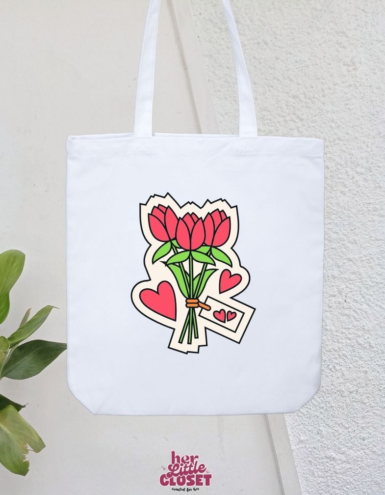 Carry your essentials in style with the Tulip Tote Bag - White. Made from 100% cotton canvas, this sturdy and eco-friendly bag features double-stitched seams and long handles for comfortable, durable use. Its playful Tulip Cut Out sticker graphic adds a fun touch, making it perfect for shopping trips, beach days, or as your go-to carry-all. Brighten your day while staying practical!